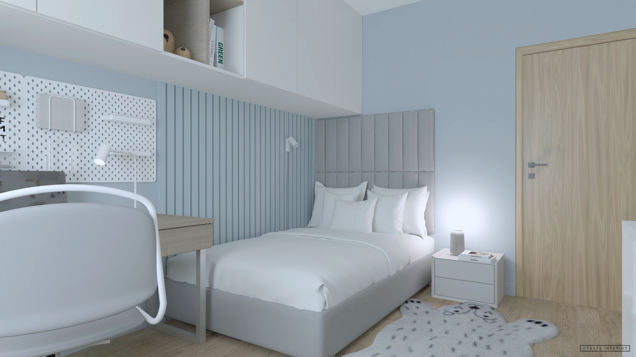 A gyerekszoba szintén egyedi bútorzatot igényelt, itt alapvetően a játékok, sulis holmik kerülnek majd tárolásra, hiszen a gyerekek ruháit saját gardróbszoba rejti majd. A szoba tulajdonosa egy kiskamasz fiú ikertestvérpár egyik tagja, így a belső színképet ehhez mérten alakítottuk ki. Itt is visszaköszön dekor elemként a lamellás falpanel. A másik testvér szobája pont ugyanígy fog kinézni, mint ez, tehát ezt külön megtervezni nem volt szükséges.