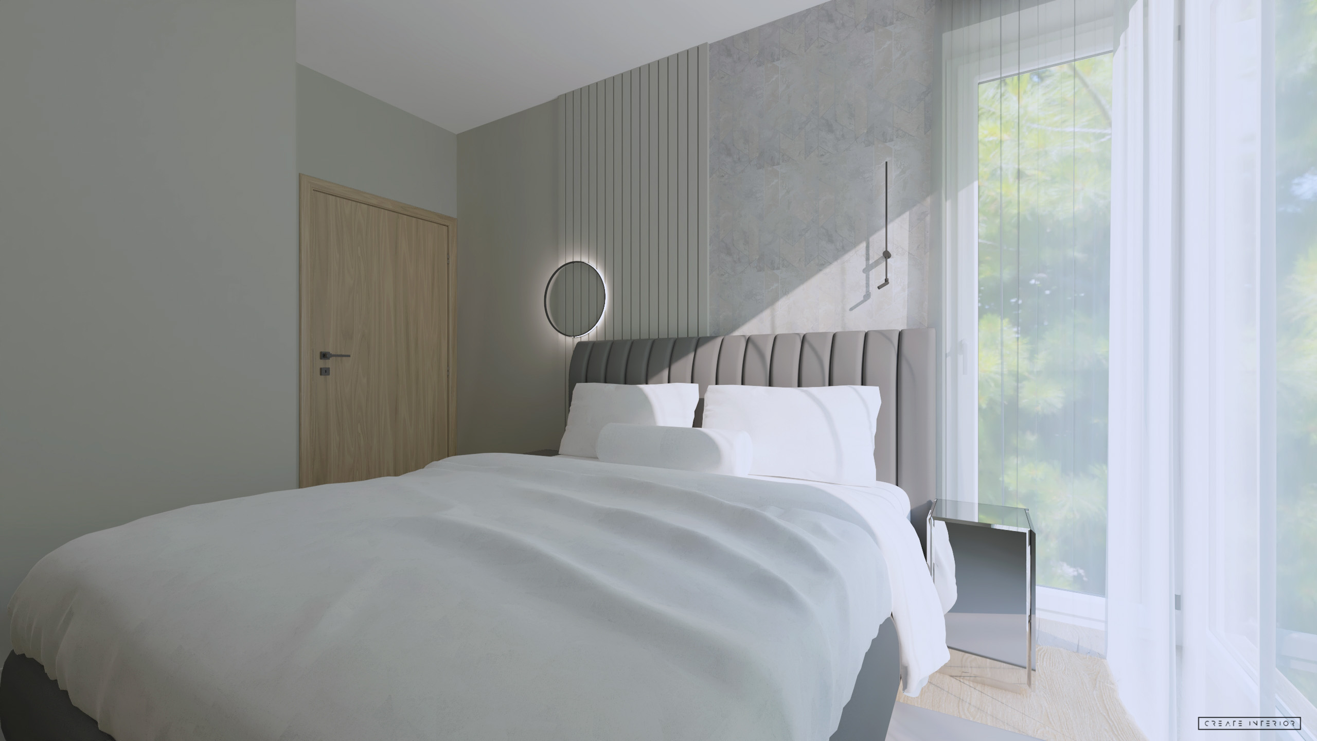 A hálószoba egyedi megoldást igényelt, mivel mindenképpen nagy ágyat szerettek volna megrendelőim, tehát 180x200 cm-es ággyal dolgoztunk. Így azonban az ágy egyik fele egy padlóig érő nem nyíló ablak elé kellett, hogy kerüljön. Mivel már így is aszimmetrikus az elrendezés, ezt kiegészítve egy eltolt lamellás panelt terveztünk, modern tapétával az ágy mögötti falra, továbbá ultra modern és menő falilámpákkal. A szoba másik végébe egy egyedi gardróbszekrényt terveztünk beépített TV fülkével.
