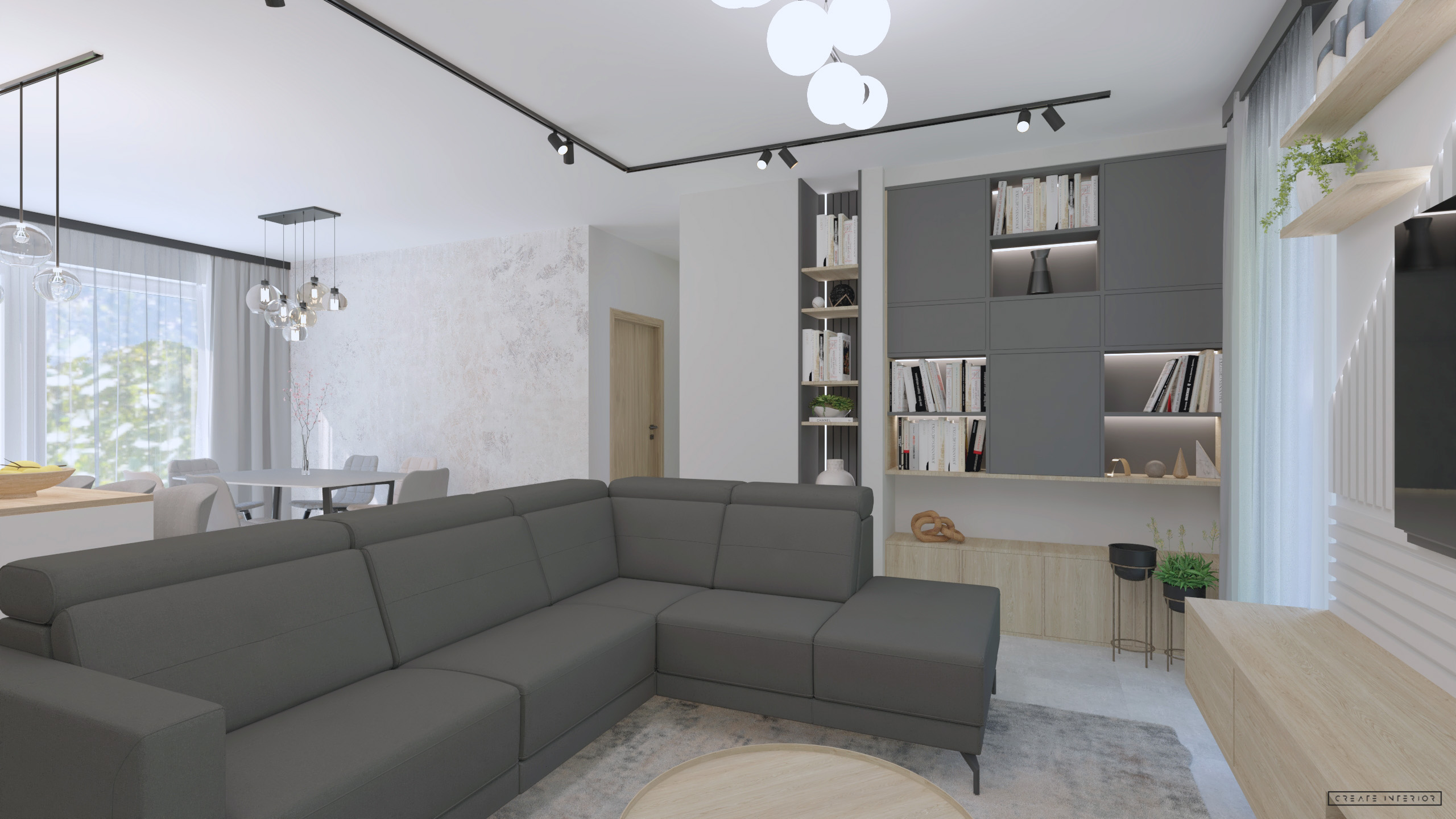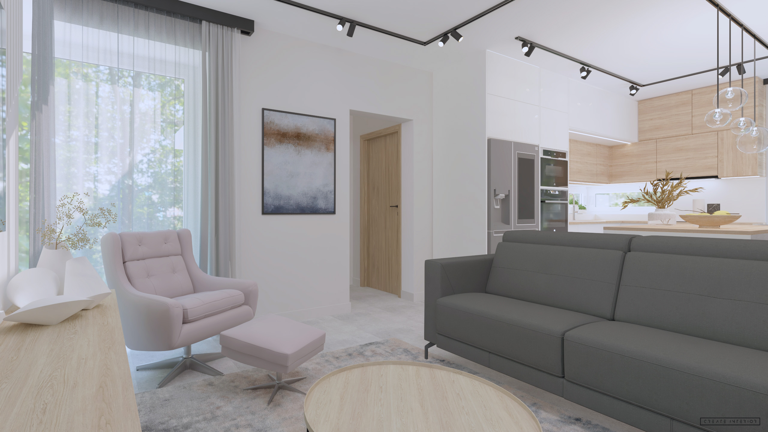 Az első projektmegbeszélés alatt a főbb irányokat megterveztük, beszéltünk a belső hangulatról, színekről, dizájnokról. A megbeszélés az inspirációs képek átbeszélésével folytatódott, de itt is olyan jól átgondolt igényeket jelöltek meg megrendelőim, hogy apró pici kiegészítések kellett csak, hogy megtaláljuk mindenben a harmóniát. Modern minimál volt az elképzelés, de ezt valami extra elemmel szerettük volna kiegészíteni. A találat végül megrendelőimé volt, egy fáradt rózsaszín olvasófotel „személyében”. Ez adta a löketet a további színkép kitalálásához. A nappali, előszoba és konyha szürke színű hidegburkolatot kapott, így a falak színeit ehhez koordinálva halvény szürkés DULUX Alabástrom szelence színre festettük. Az étkező falra egy olyan fotótapétát találtunk, mely gyönyörűen visszahozza a nappaliban elhelyezett fáradt rózsaszín színű fotelt. Az absztrakt mintája pedig izgalmas kiegészítője a konyha-étkező-nappali résznek.
