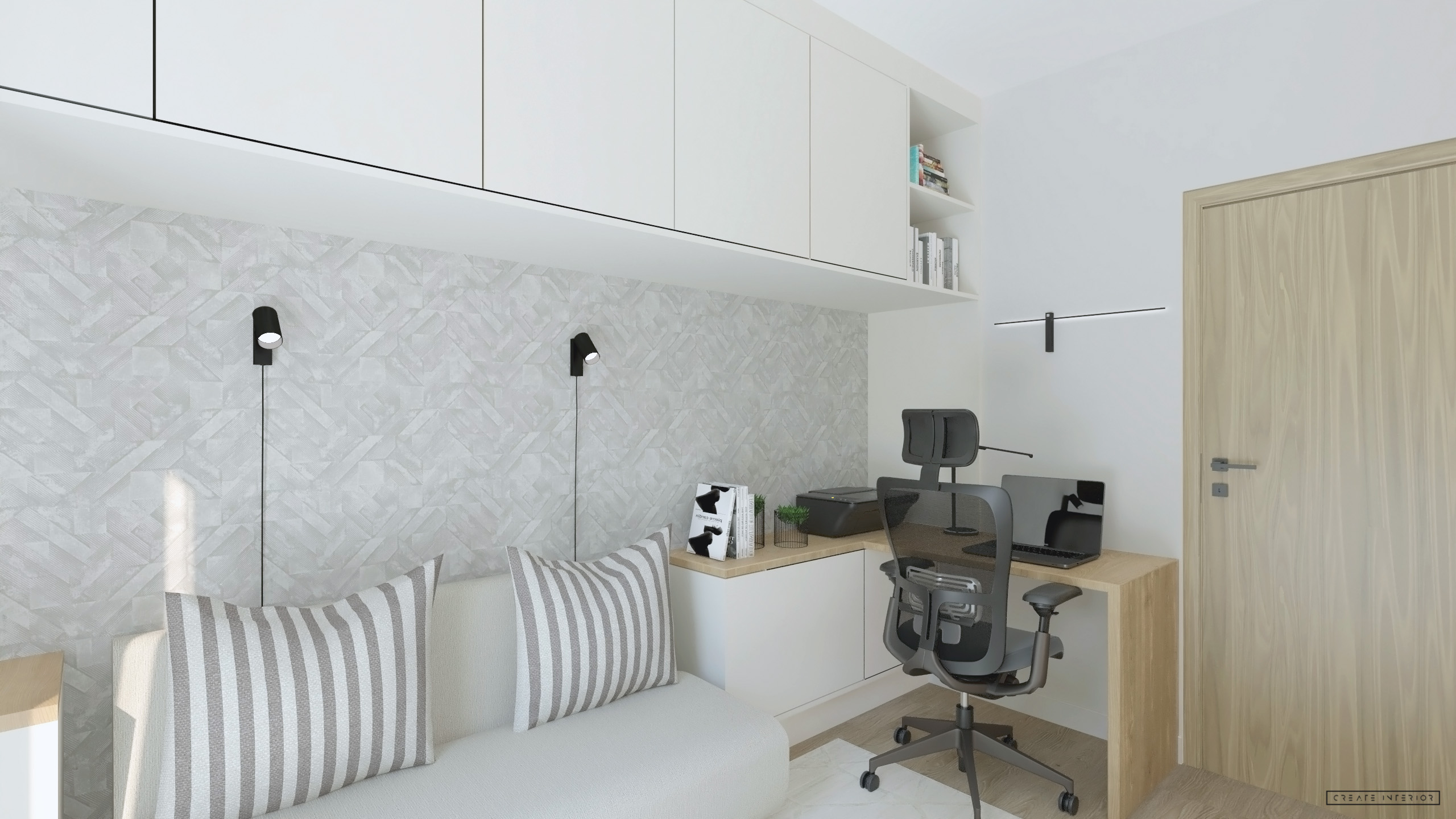 A dolgozószoba több funkciót tölt majd be, hiszen ez lesz majd a vendégszoba is. Mivel ez a tér viszonylag kicsi, itt szinte az egész bútorzat egyedi tervezést igényelt. Egy praktikus fotelágyat kvázi körbekerítettünk magas szekrényekkel, ehhez továbbá egy íróasztalt is elhelyeztünk a sarokban.