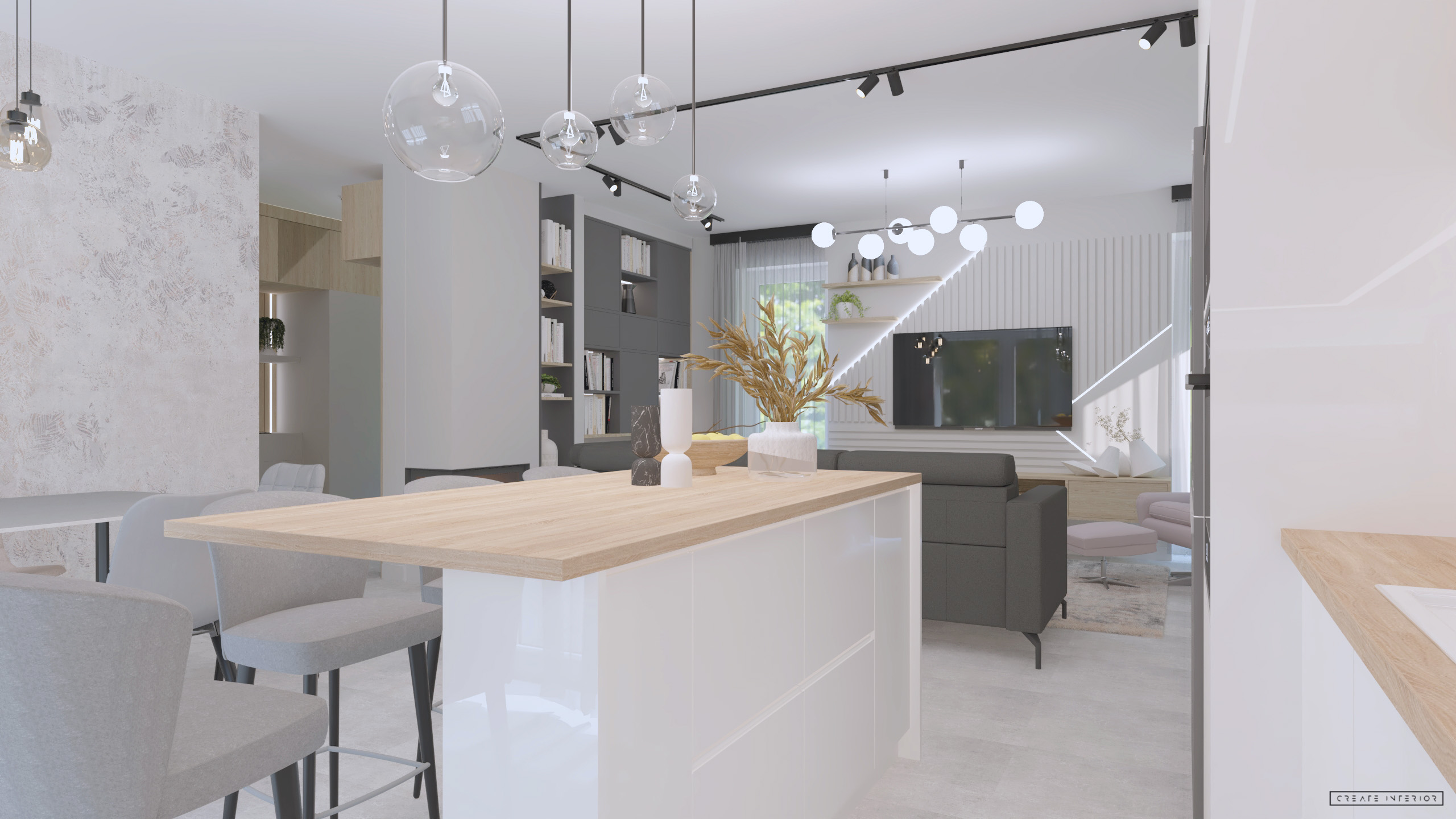 A konyha közepére egy közös használatra tervezett konyhaszigetet helyeztünk el, melyet teljesen körbe lehet ülni, akár mind a négyen együtt tudnak majd üldögélni, ha szeretnének. A színkép itt is adott volt, olyan tekintetben, hogy megrendelőim kezdetektől fogva fehér és famintás konyhabútort terveztek, famintás munkapulttal és fényes fehér hátfallal. A bútor szerkezetét azonban az én ötleteim szerint módosítottuk, hogy így kényelmes és praktikus rakodóhelyeket teremtsünk.