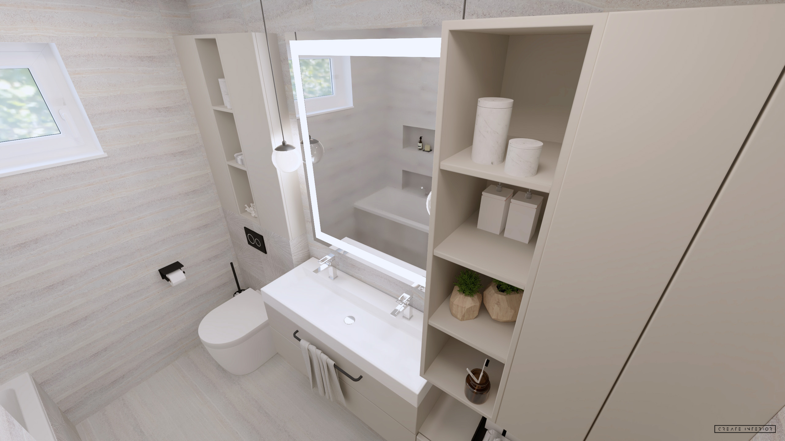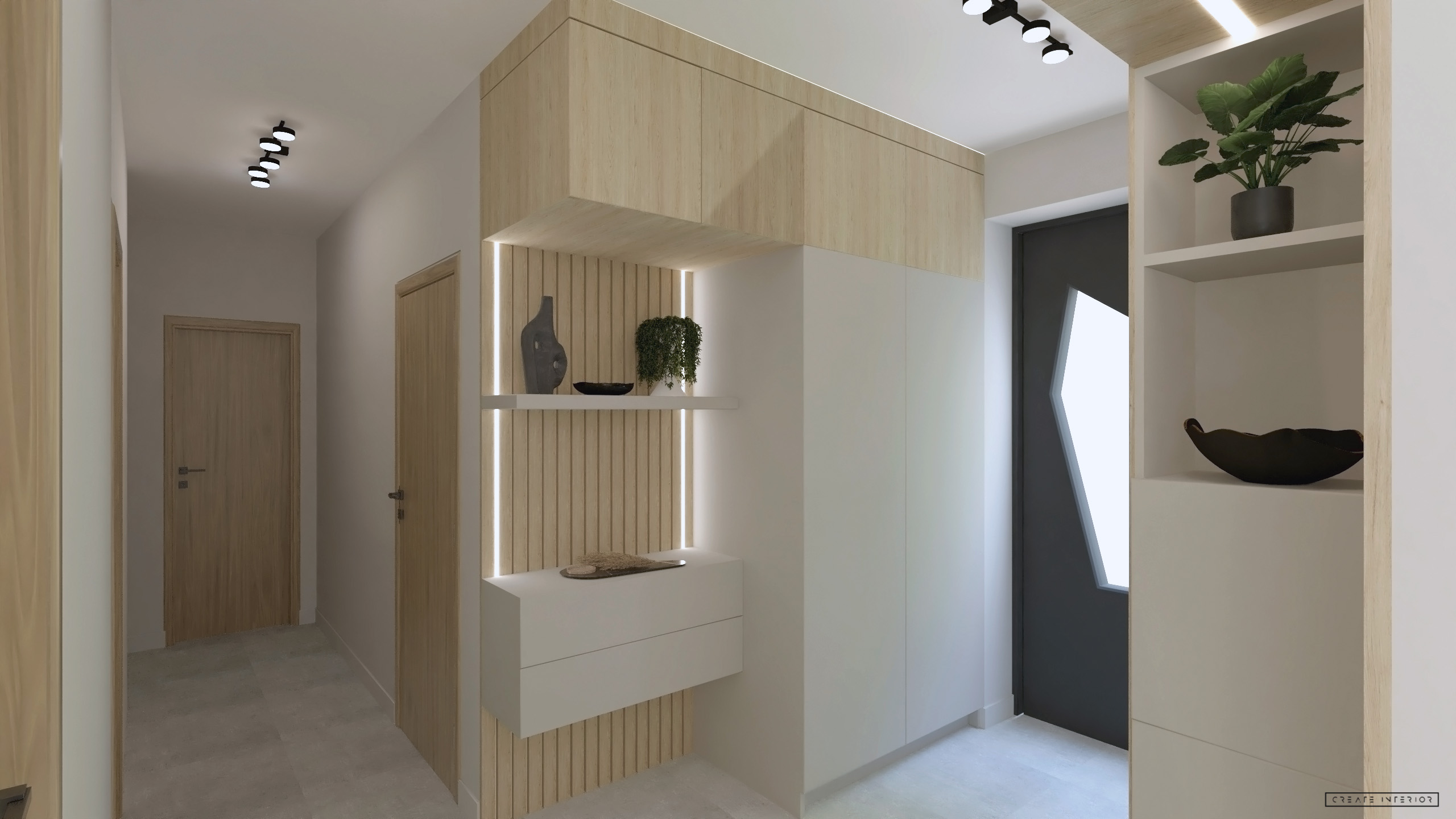 Az előszobában pedig szintén egyedi tervezésű pakolós szekrényeket helyeztünk el, de itt alap igény volt egy szabad polc, vagy fiók elhelyezése, hogy pl. napszemüveget vagy kulcsot elérhető helyen tárolhassanak megrendelőim. Terveztünk egy kis leülő alkalmatosságot is, a pad alatt pedig cipőket lehet tárolni majd. A falfülke másik oldalára pedig egész alakos tükröt terveztünk további cipők tárolására alkalmas szekrénnyel.