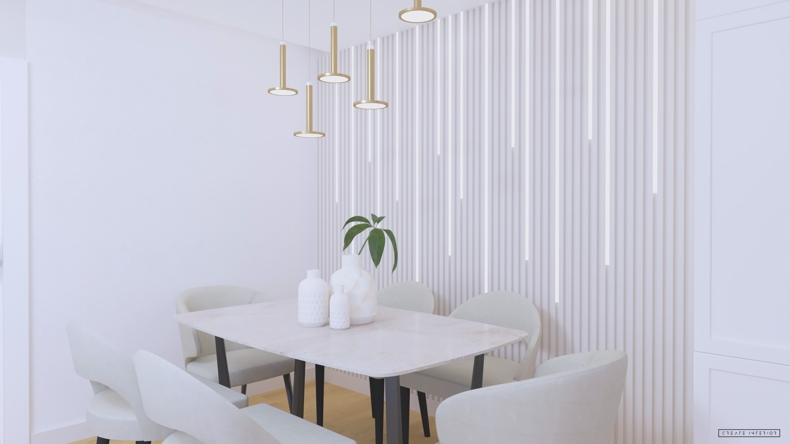 Az étkező lamellás falburkolata már a legelején egy kulcsszereplő volt a megbeszéléseknek. Innen nem is tágítottunk, azt gondolom nem is baj, mert elég szépen sikerült a tervezés. A teret egy másik tapétával egészítettük ki, Arte Moooi Mimic Moth-ra esett a választás.