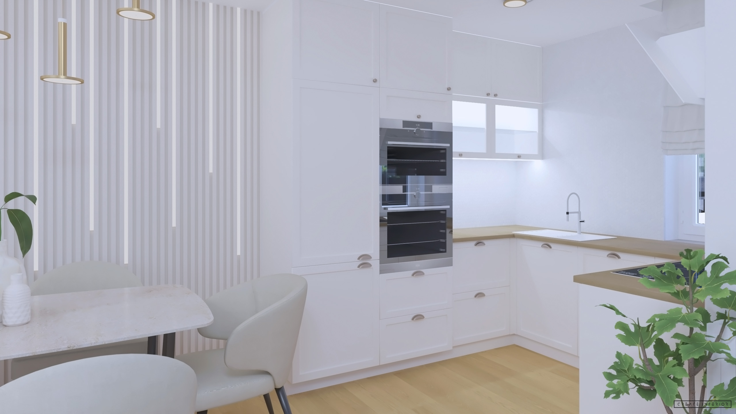 A konyha is megújult. Eredetileg azonban ez nem volt része a projektnek, de időközben megrendelőim úgy gondolták, hogy a régi konyhabútor semmilyen szempontból nem illik bele az összképbe és mivel pár éven belül úgyis felújították volna ezt a helyiséget is, már miért ne tették volna akkor, amikor az egész lakás megújul már az elején. Szóval végül új konyhabútort is terveztünk, mely sokkal praktikusabb, mint az előző volt.