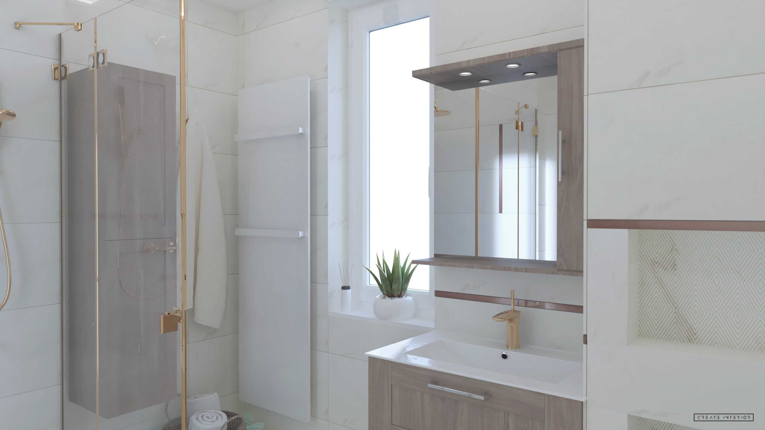A fürdőszobákban mindent kicseréltünk és megrendelőimmel együtt egy gyönyörű Tubadzin csempét választottunk, melyet néhol Serenity nevű arany díszcsíkkal dekoráltunk. Ehhez azt gondolom igazán passzol az arany keretes zuhanykabin és szaniterek, de persze mindent úgy terveztünk meg, hogy az arany díszcsík elhagyása nélkül króm színnel is szuperül mutasson a végső színkép.