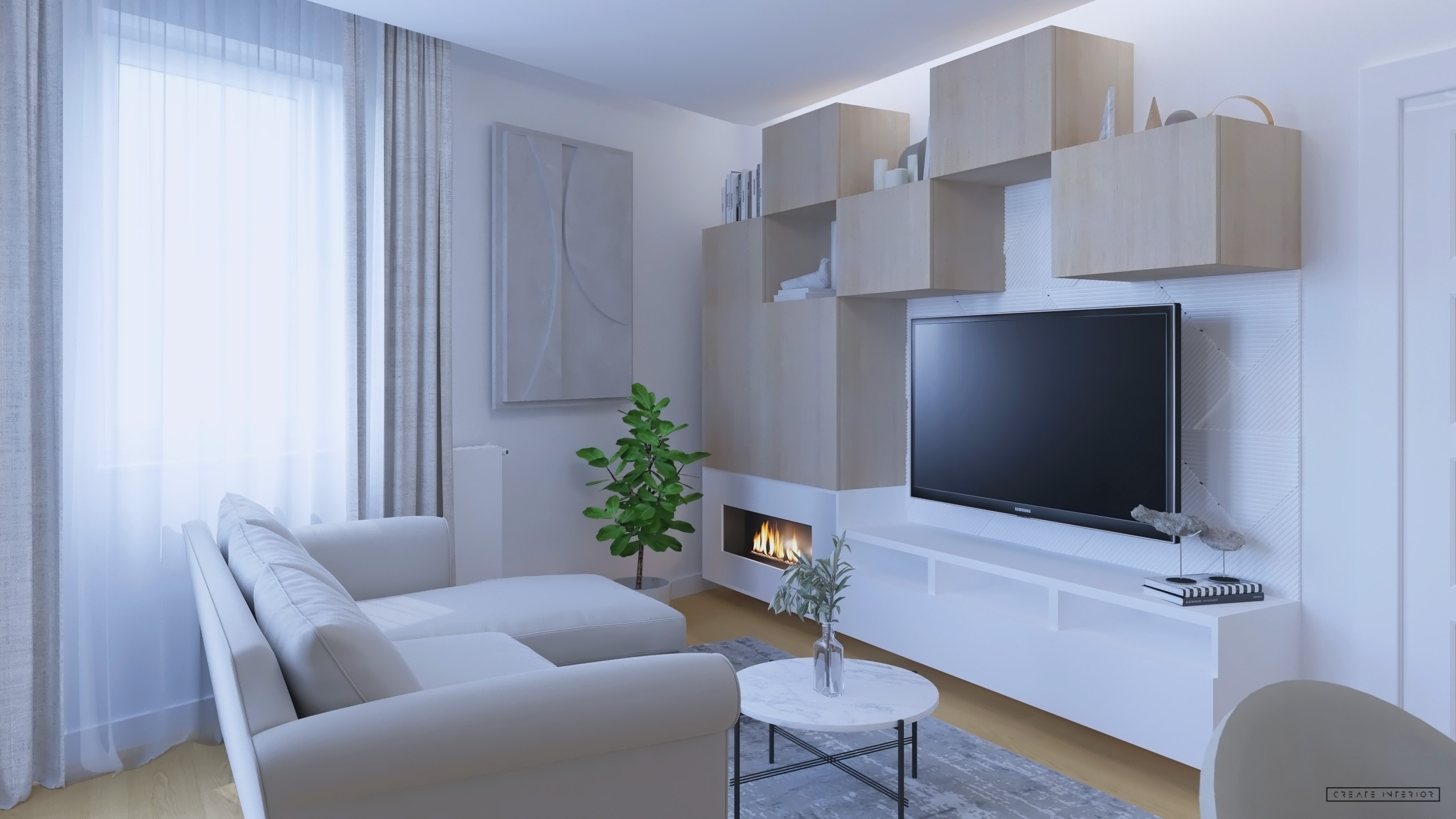 A nappali és étkező tere (és persze a konyha is) egy térben található, a kiosztás itt is szerencsétlen egy ferde fal miatt, de ezen változtatni nem tudtunk természetesen. Alapvetően a médiafal tekintetében annyiban állapodtunk meg, hogy ne legyen nagyon tömött és zárt, de nyitott polcokat sem szeretnénk, így végül a képeken látható elrendezést álmodtuk meg közösen, amibe egy másik régi kívánságnak is helyet adtunk, egy elektromos kandalló kerül majd beépítésre. A médiafal mögötti falrészt pedig Kerma falpanel burkolja majd.