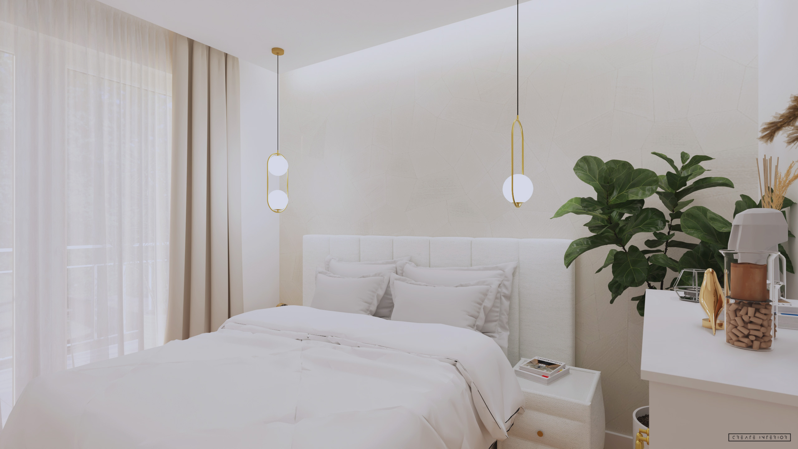 A lakás szerencsétlen elrendezéséből elsőként a hálószobát emelném ki, hiszen ez méretét tekintve a legkisebb szoba, sőt még egy falugrás és ferde fallal is nehezítette a terepet. Itt egy kényelmes gardróbszekrényt terveztünk a szülőknek, valamint ezen kívül már csak egy komódnak maradt hely. A színkép megrendelőim kívánsága szerint fehér alapra épít. Egy gyönyörű Arte tapéta egészíti ki a képet, az Aurora fehér színben. Elképesztően gyönyörű, nagyon kedvelem ezt a vinyl tapétát. Mivel a tapéta finomsága megengedi, a további kiegészítők, mint a mennyezeti lámpa, függőlámpa esetében az arany színt vetettem fel megrendelőimnek moodbordban és imádták az összképet. A választás a Nova Luce lámpáira esett, a két függőlámpa, melyek olvasólámpaként funkcionálnak az Obitar családból, a mennyezeti lámpa pedig a Leon. A további eleganciát és melegséget a rendkívül kényelmes kárpitos boxspring ágy és a hozzá tartozó kárpitozott éjjeliszekrények adják. A függönyök is színben passzolnak, itt a JAB egyik kollekcióját, a Softie névre hallgató lakástextilt választottuk, azt hiszem ezt a neve alapján nem kell magyarázni, hogy miért.