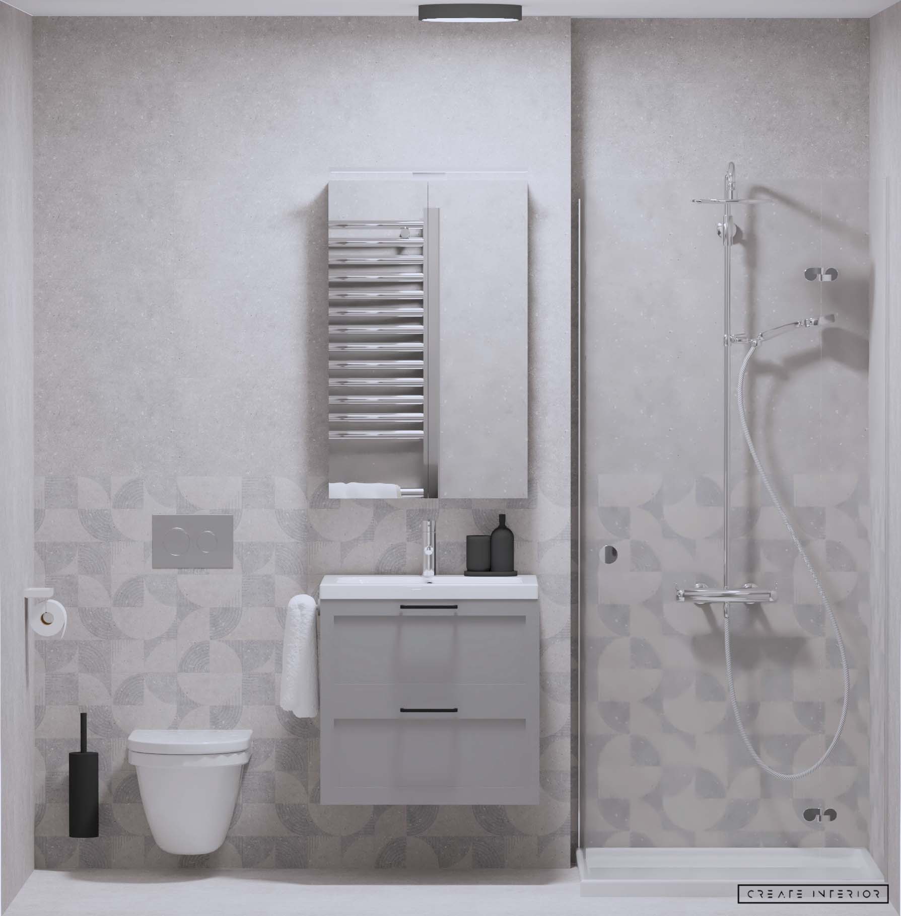 Az öltözőben természetesen öltözőszekrényekre volt szükség és persze elegendő ülőfelületre. Plusz alap igény volt, hogy ebből a térből nyíljon a fürdőszoba, melyben egy kedves, de maszkulin árnyalatú szürke burkolatot választottunk.