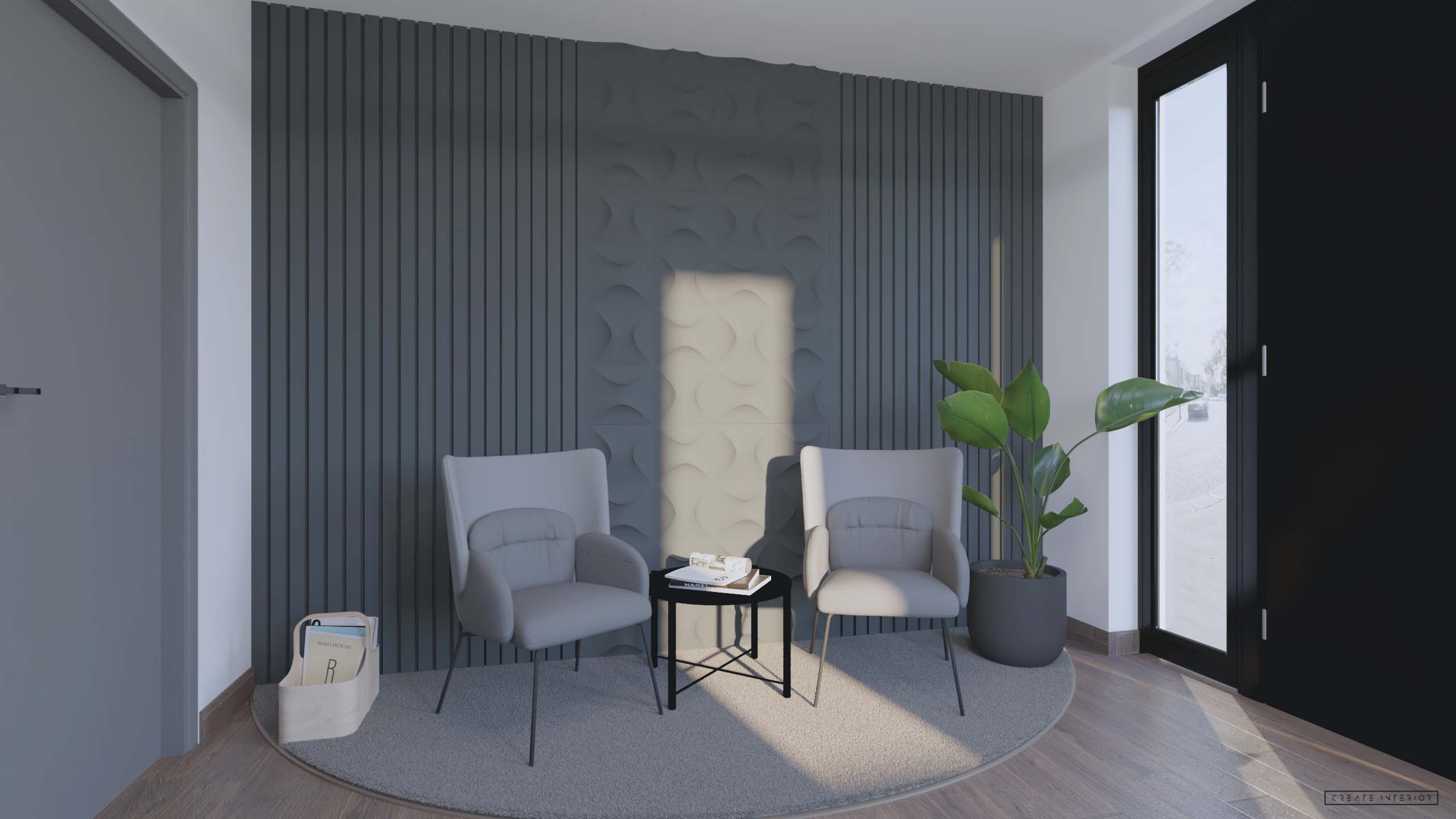 Az előtér egy vendégfogadó tér is recepció nélkül. Itt csak annyi igény fogalmazódott meg, hogy legyen hely leülni, kedves és barátságos legyen, és legyen hely a vendég kabátoknak. A leülős részt modul szőnyeggel egy kicsit otthonosabbá kívántam varázsolni, melynek köríves formája mindenképpen izgalmas ebben a térben. A leülős rész mögött pedig nagyon érdekes hatást keltenek a 3D-s falpanelek, melyeket a térhez választott falszínre festettünk.