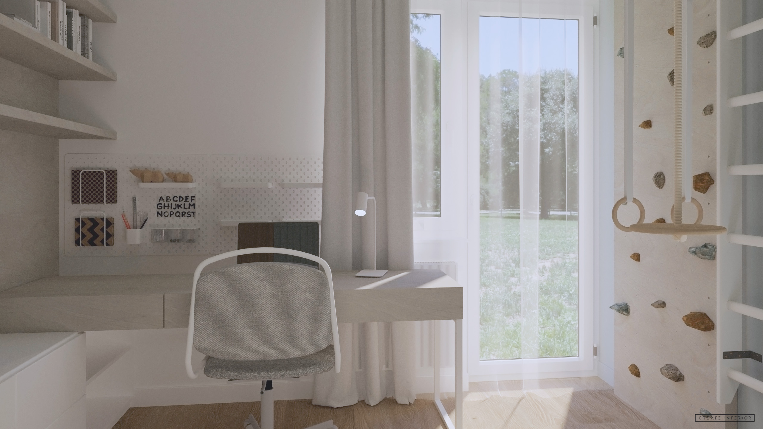 A gyerekszoba azt gondolom nagyon izgalmasra sikerült. A lakásban nagyon szerencsés a 3 méter közeli belmagasság, itt azonban ezt oly módon tudtuk kihasználni, amelyet minden gyermek megirigyelne. Az enyéim legalább is biztosan, ezt a tervezés alatt többször is tudtomra adták, szóval tudom mi a feladatom a továbbiakban. A gyerekszobának igazodnia kell a felnővő gyermek igényeihez is, tehát nem csak a jelenlegi állapotot kell figyelembe venni. Az íróasztalt médiafallal egészítettük ki, ahol egy hatalmas méretű tv is elfér majd, ha eljön az ideje. Az ágy mögötti falat kárpitozott falpanellel tettük izgalmasabbá és egyben kényelmesebbé is. Ezen a falon egy mászófal és egy bordásfal is betervezésre került és ez az, amit a fiaim olyan rettentő módon elirigyeltek.