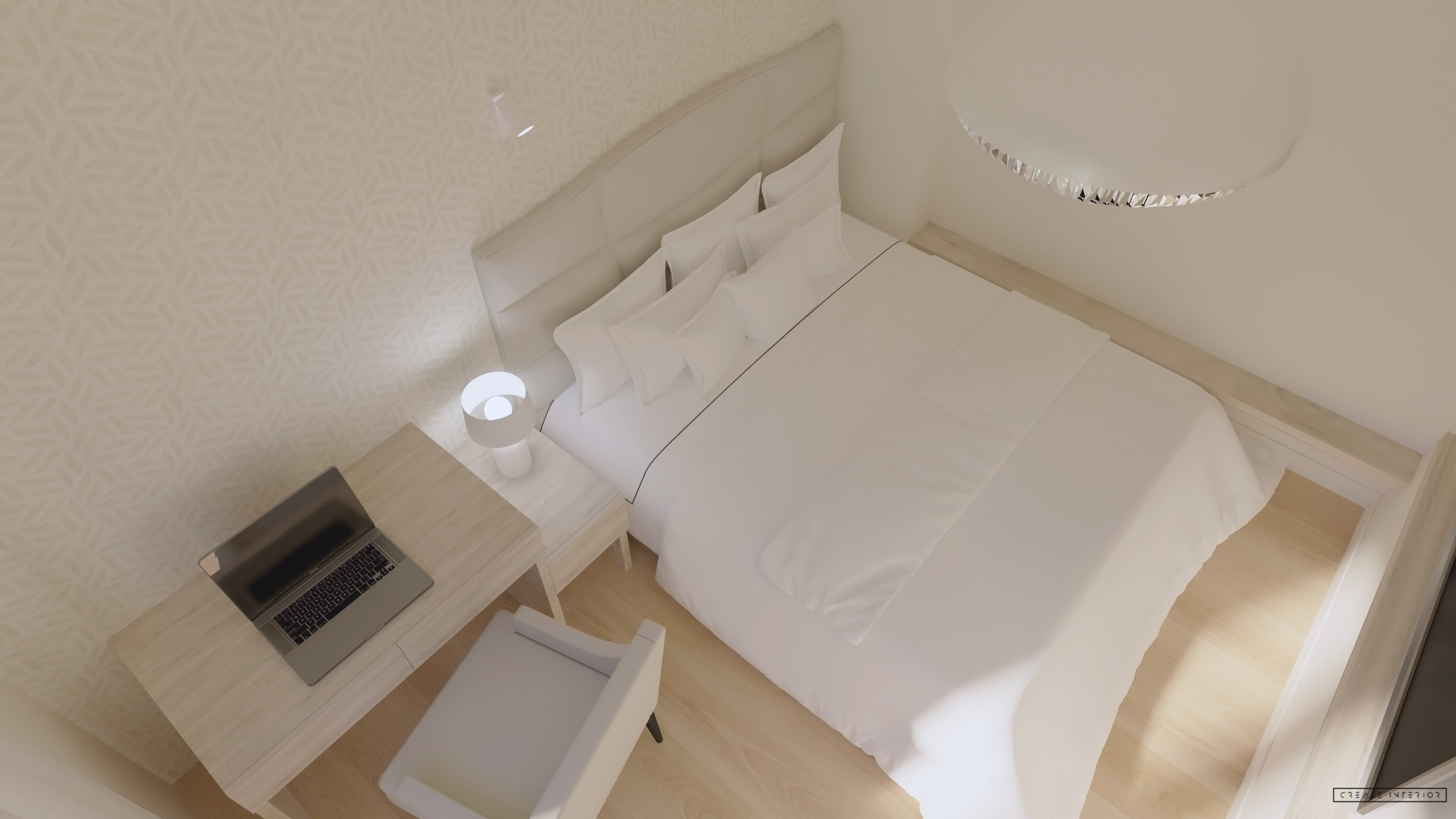 A hálószobában a kéket már elhagytuk, itt azt gondolom egy-egy apróbb kiegészítő esetében lehet bevinni szükség esetén, például dekortárgyak, képek, lámpa stb. Itt a bézs dominál és a Diegoban talált vlies tapéta, mely Peace néven fut. A hálószobával kapcsolatban még egy alapvető igény lett volna egy kis írtóasztal elhelyezése, de rettentően kevés hely maradt, így végül csak egy végtelenül egyszerű asztalkát terveztem, mely az egyedi éjjeliszekrényekkel olvasztható össze.