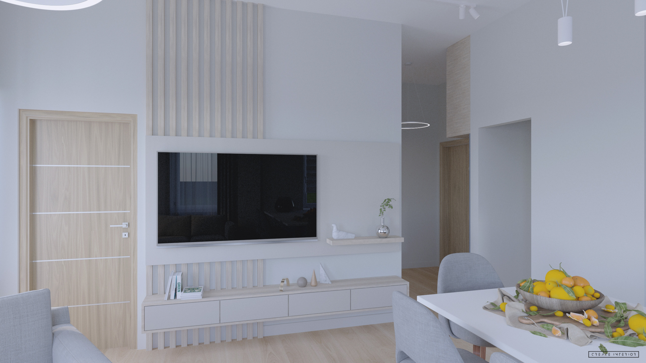 Ahogy a tervezés egyre jobban haladt előre, úgy derült ki számunkra, hogy a kék szín alapvetően mindenkinek tetszik, így ezen felbátorodva további helyiségekbe is bevittük ezt. A konyhában egy visszafogottabb árnyalatot választottunk ugyan, az Egger Füstös Kék bútorlapjával terveztük meg a konyhát, melyet egy nagyon kellemes famintás Egger Whiteriver Homok Sárga Tölgy bútorlappal egészítettünk ki. A nappaliban további kék színt már csak kiegészítők formájában helyeztünk el. A médiafal egyedi tervezést igényelt, nem volt szükség tárolók és szekrények tervezésére, így alapvetően csak egy keretet szerettem volna adni a televíziókészüléknek.