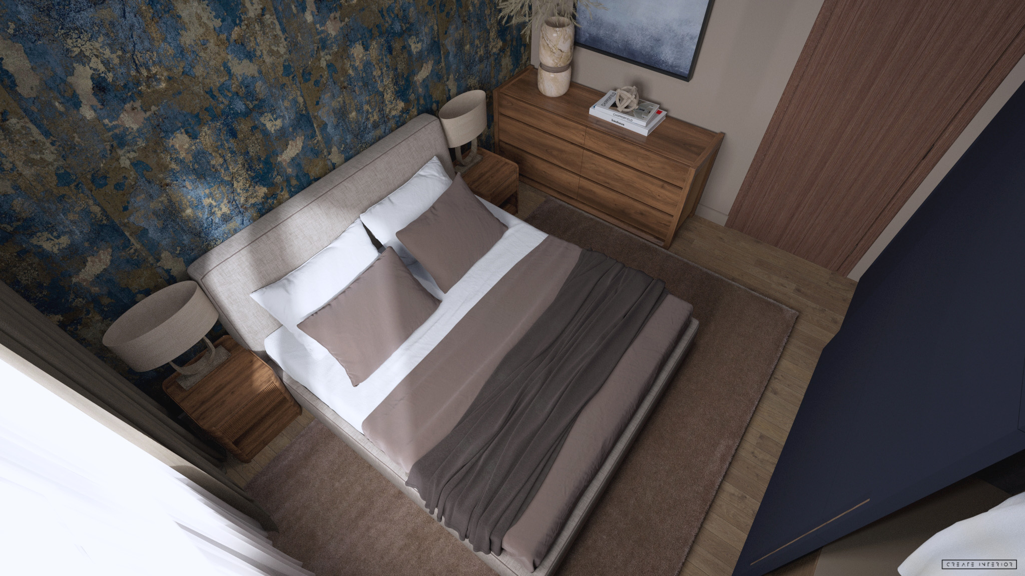 A lakásban még két további helyiség található, a hálószoba és a másik szoba, aminek mivel még alapfunkciója nincs, így egyelőre egy home office szerepét tölti be. A hálószoba belső színképe a korábbiak ismeretében tehát adott volt, itt is barnás, kékes színeket szerettünk volna alkalmazni, mindezt úgy, hogy kellemes bensőséges hangulatot teremtünk meg. Ebben nyilván segítségünkre vannak a lakástextilek, tapéták és persze a bútorok is, de egyáltalán nem mindegy, hogy milyen elemeket pakolunk össze és az sem, hogy honnan indulunk el. Minden helyiségben egy fókuszpontot választok ki és az egész design tervet ehhez igazítom. Itt most egy gyönyörű tapétára esett a választás, az olasz Parato egyik lenyűgöző kék-arany vakolat mintás tapétájára. Ez remek alapot adott a textilek kiválasztásához és a további színtervezéshez.