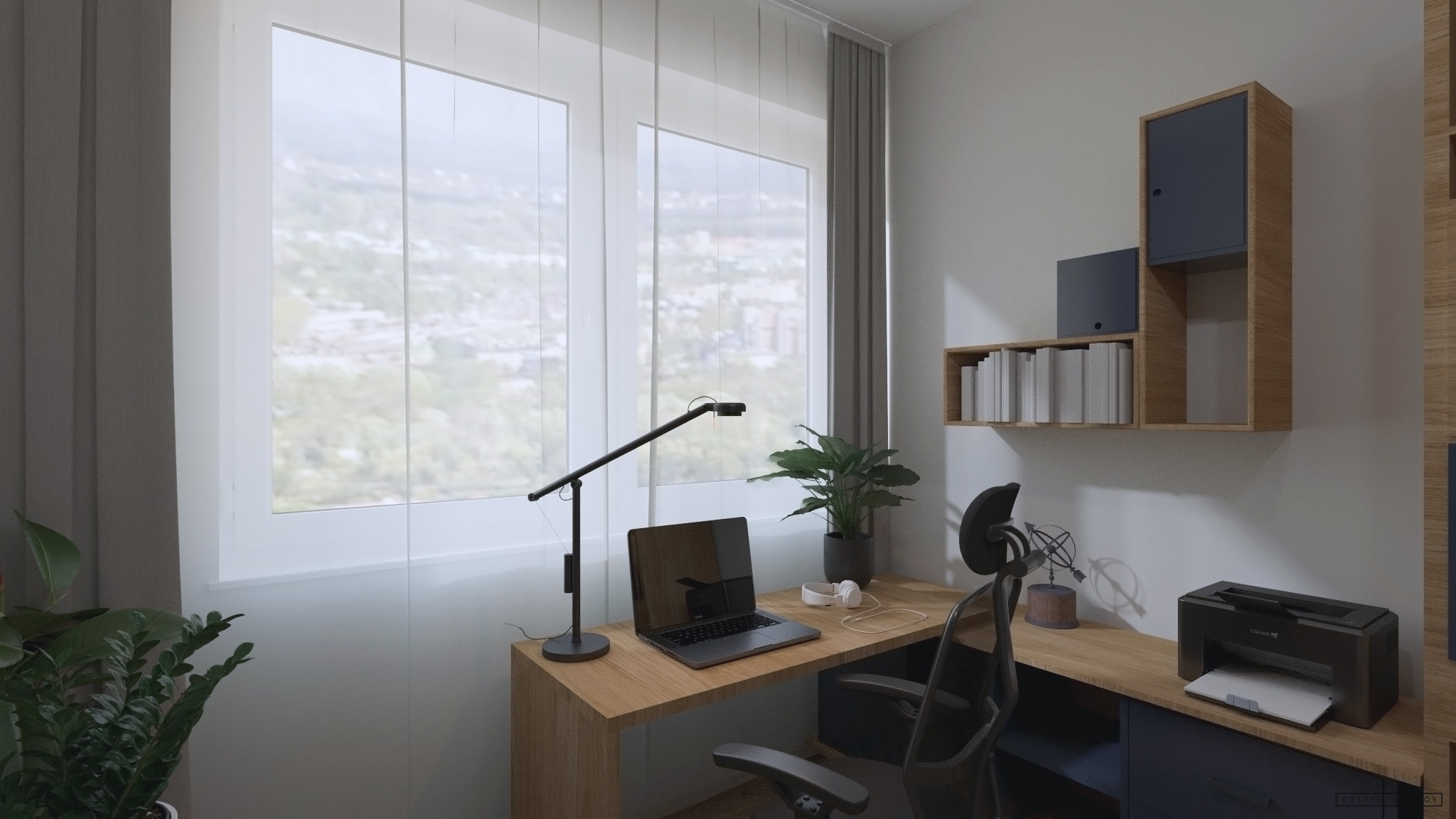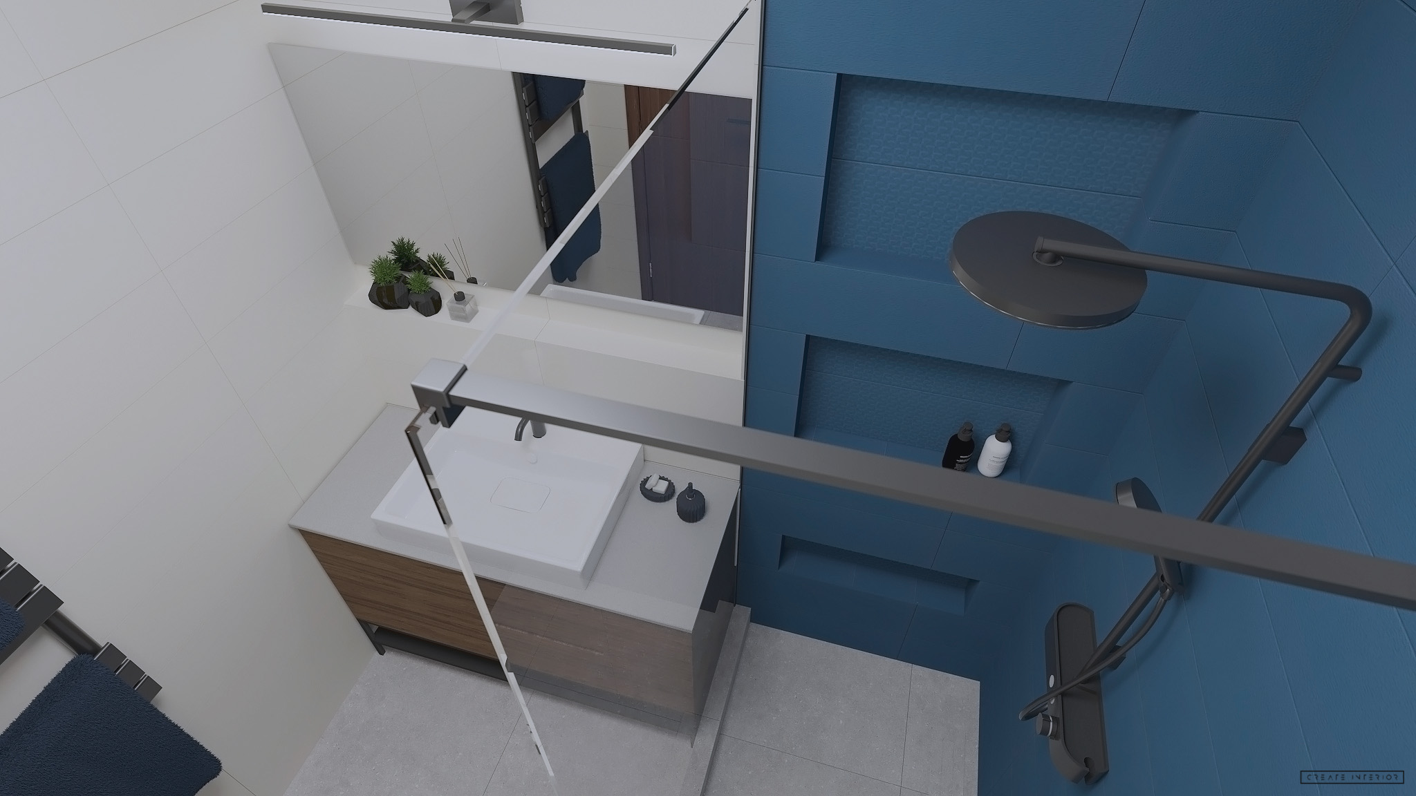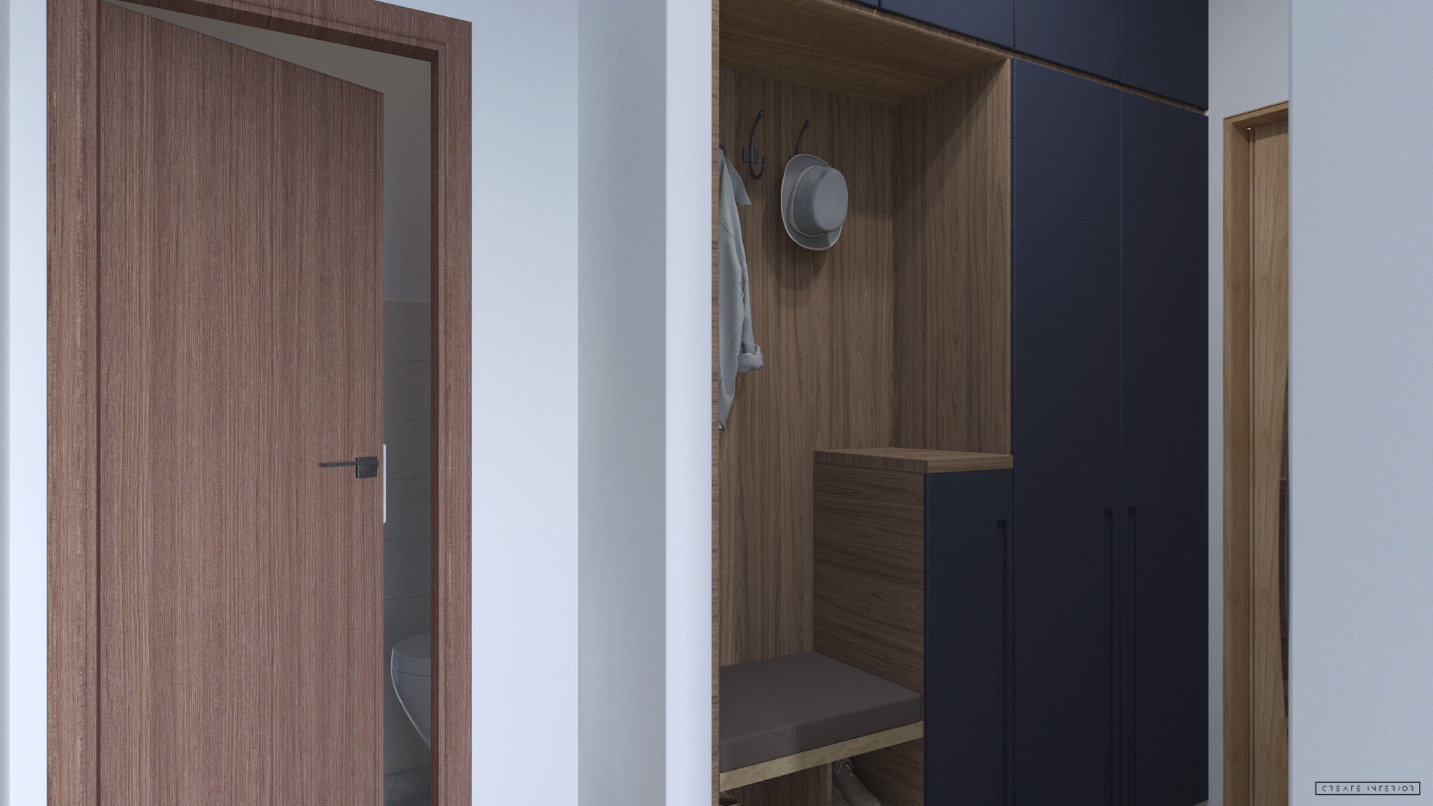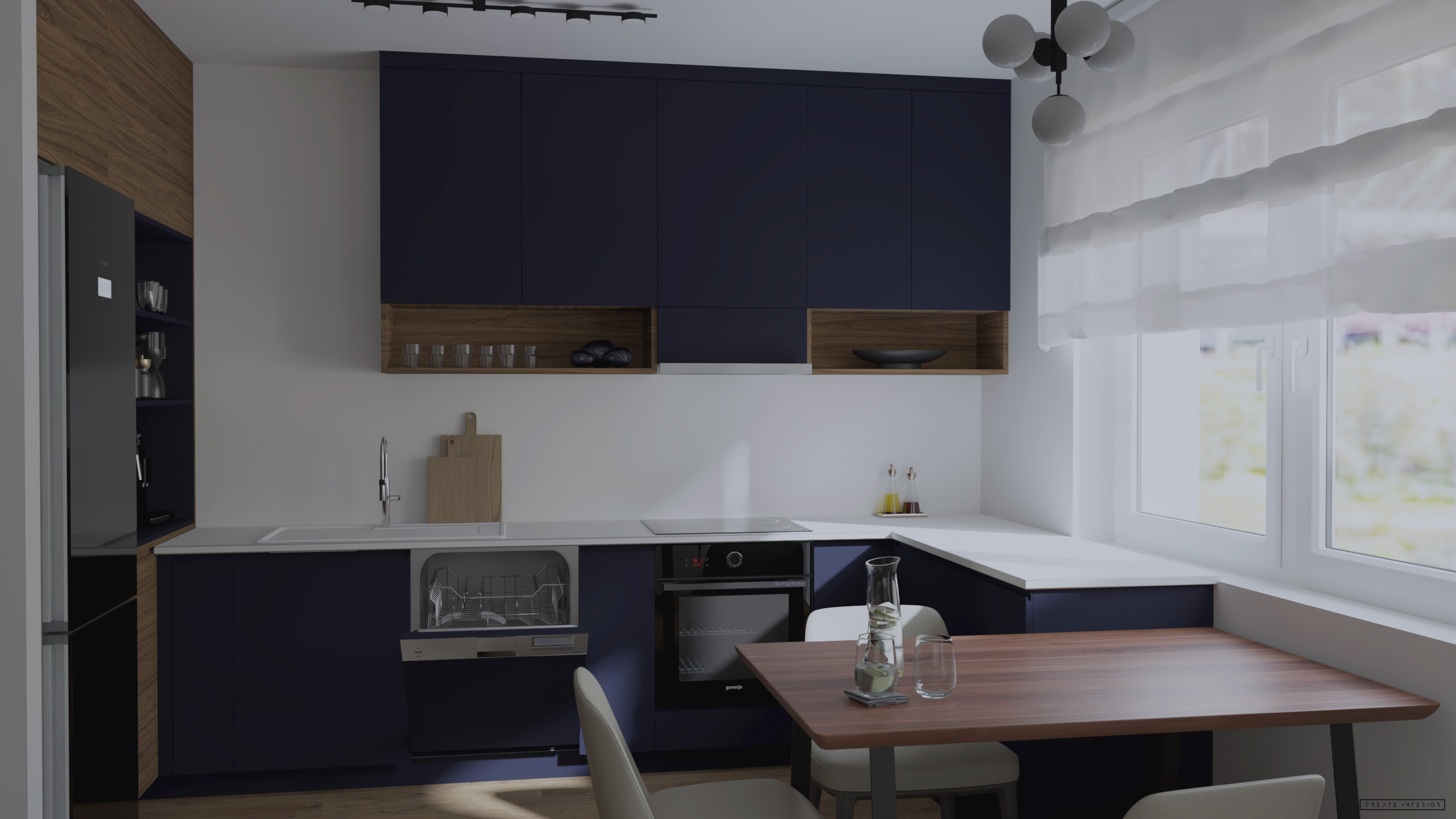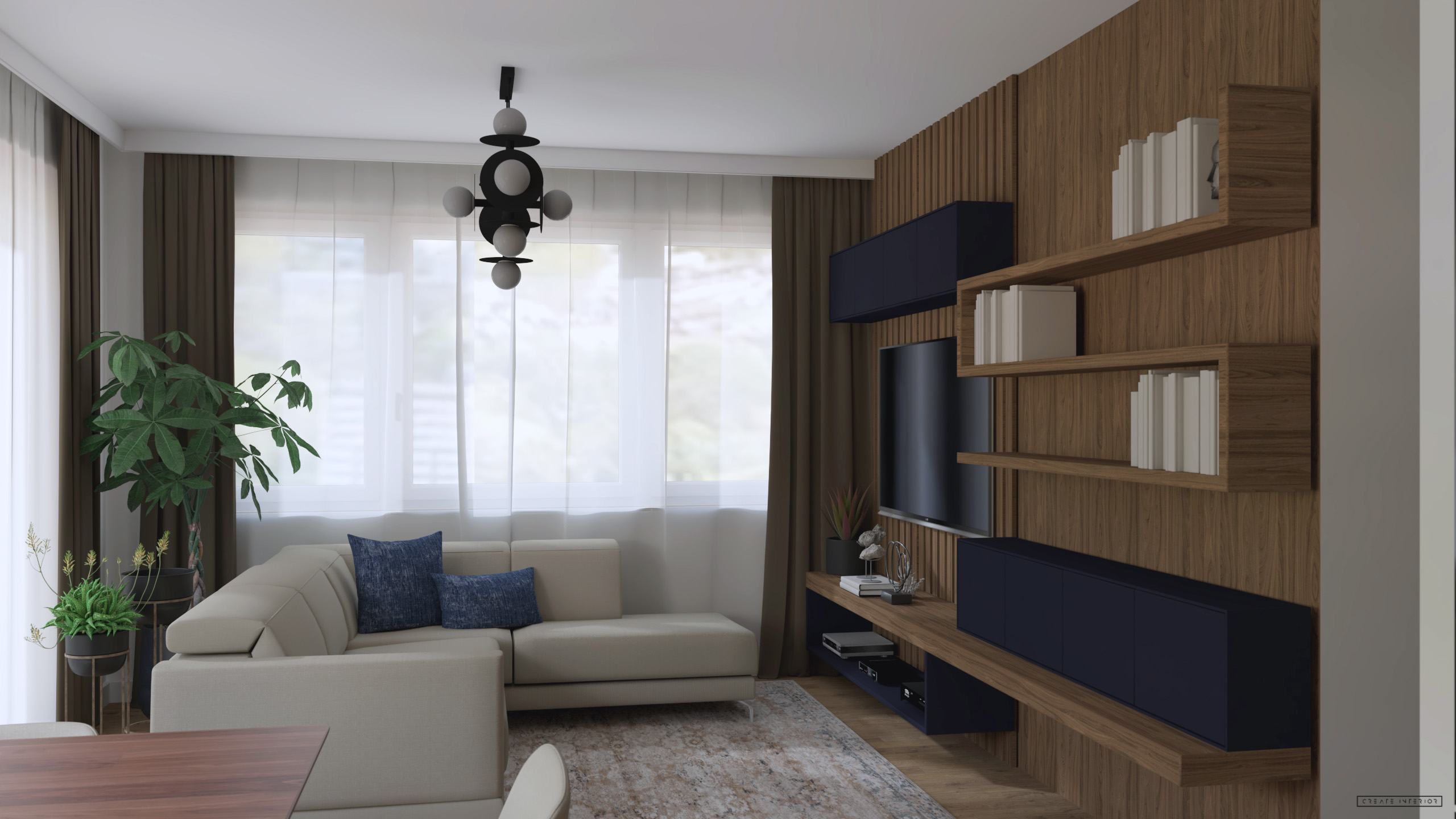 A belső terek koncepciótervezésében gyakorlatilag szabad kezet kaptam, ennek ellenére én mégis fontosnak tartom, ha a megrendelőimet is belevonom a döntéshozatalba, hiszen mégis csak az ő otthonukat tervezem meg. Mint minden tervezés ez is brainstorminggal, inspirálódással kezdődött, aminek eredményeképpen megállapítottuk, hogy egy mérsékelten maszkulin, de mégis kellemes melegséget árasztó modern stílust szeretnénk egy kis urbánus beütéssel. Ez valóban elég kesze-kusza leírás volt, de azt gondolom, hogy manapság már az összes valamirevaló lakberendezési stílus keveredik egymással és a végeredmény mégis csak egy modern enteriőr lesz. Megrendelőm már a tanácsadás előtt meghatározott vágásokat, amik mentén végül az egész tervezést végig vittük. Ennek egyike a kék konyhabútor. Itt piciny szívem már megdobbant, hiszen olyan izgalmas valamilyen bézstől és fehértől eltérő színes konyhával tervezni. Választásunk az Egger Indigó kék bútorlapra esett a konyhabútort és a nappali médiabútort illetően. Ezt pedig az Egger Natúr Carini Dió famintás bútorlappal egészítettük ki. Ez a meleg tónusú barna famintás bútorlap olyan kellemes otthonossággal tölti meg a teret, ami, azt gondolom, már a látványterveken is érezhető. A nappali médiafalát lamellás falpanellel és bútorlappal dobtuk fel, így egy kellemesen modern keretet adtunk az egyedi bútoroknak, melyek a könyvek tárolását és a tv nézéshez szükséges kisebb eszközök esztétikus elhelyezését fogják szolgálni.